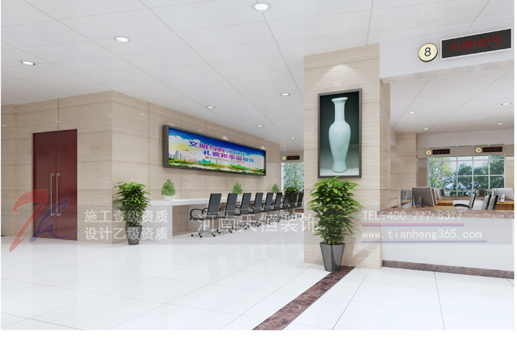 設計說明:因為本次設計的單位是國家單位,所以崇尚簡潔大氣又不是嚴肅隆重之感。本次設計就采用一些后期的裝飾、配飾來增添其整體寬敞明亮的氛圍,合理的布局規劃使整個空間讓市民感覺更便利。